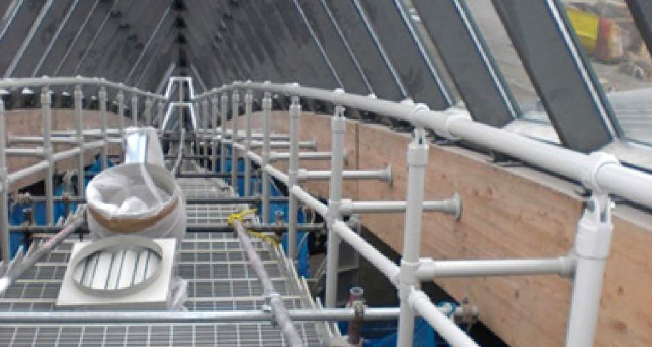 Im Dachfirst der Harlow Gateway Freizeitanlage wurden über 160 Meter KEE LITE Sicherheitsgeländer aus Aluminium installiert. Das Geländer ermöglicht den Angestellten einen sicheren Zugang für Wartungsarbeiten in der Glasdachkonstruktion.