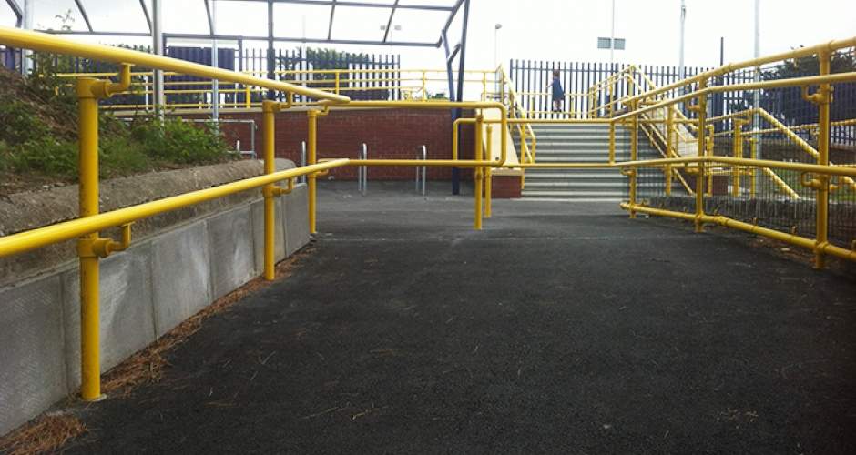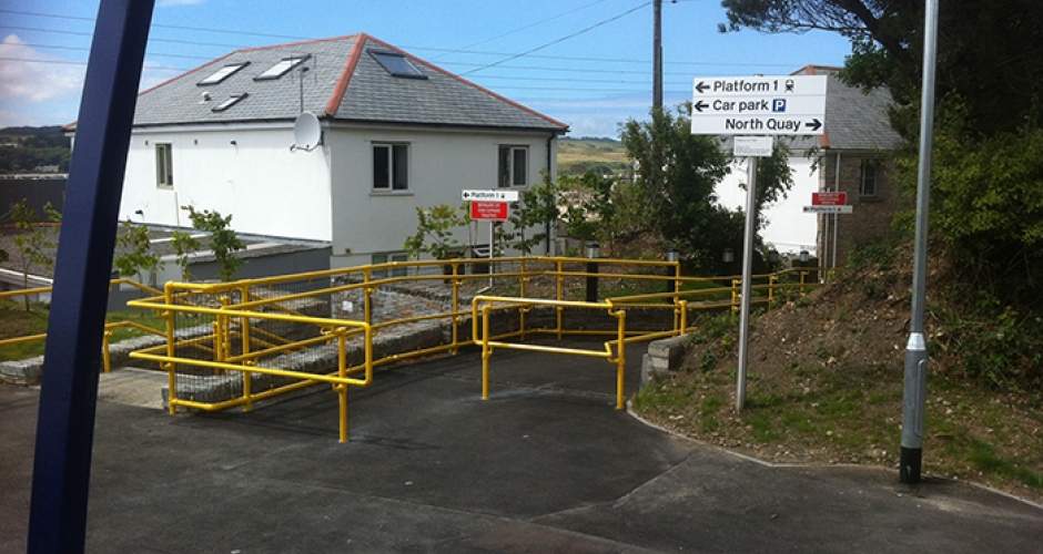 Auf den Bildern sehen Sie die installierten Sicherheitsgeländer mit griffsympathischen Handläufen, welche am Bahnhof Hayle Railway Station in Cornwall installiert wurden. Die Handläufe sind in der Farbe Sicherheitsgelb pulverbeschichtet.
