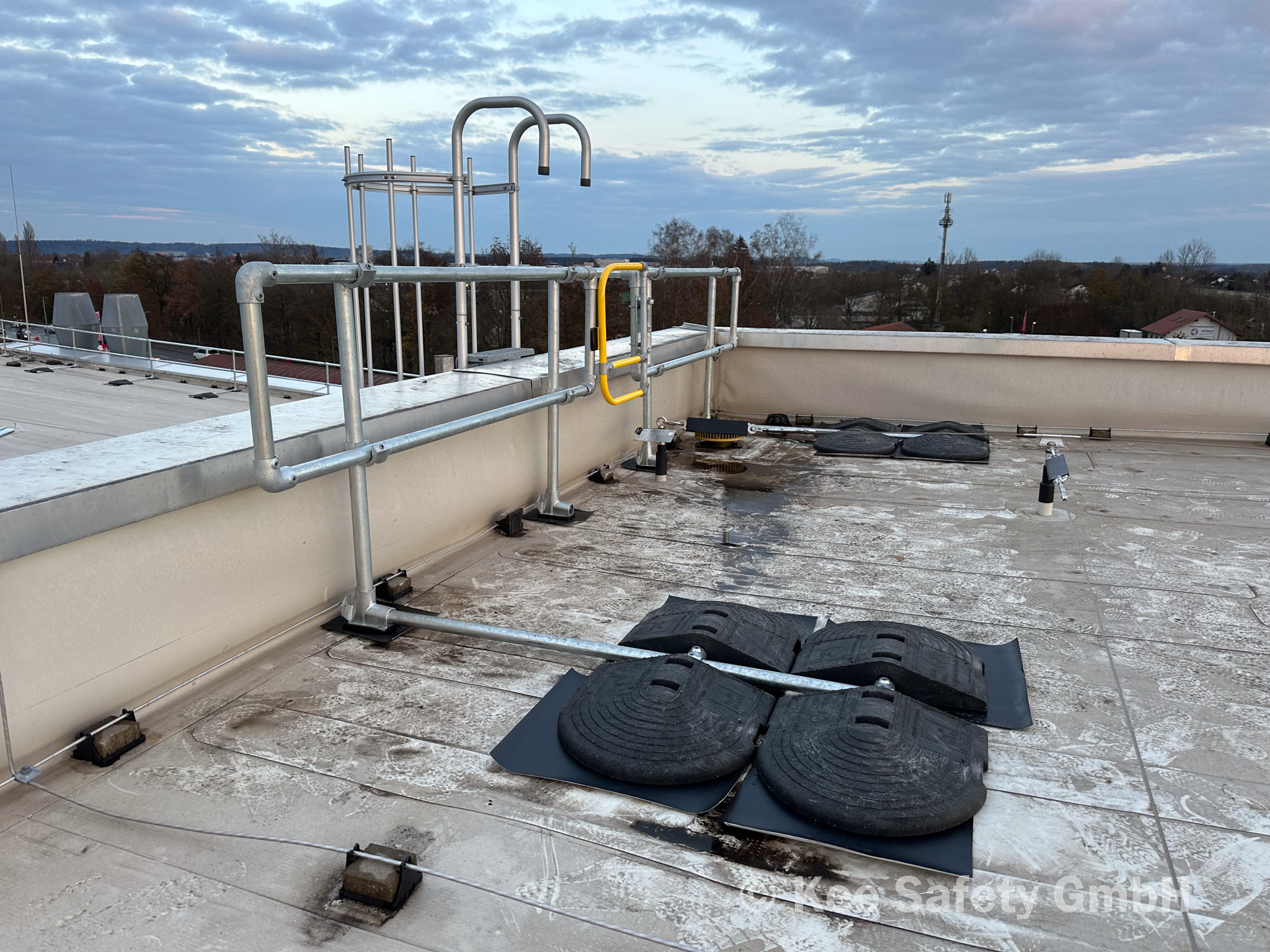 Die DB RegioNetz Verkehrs GmbH benötigte an einem ihrer Standorte in Süddeutschland eine Absturzsicherungslösung auf ihrem Dach. Nach einem Vor-Ort-Termin und einer entsprechenden Beratung des Kunden wurde das freistehende, auflastgetragene Sicherheitsgeländer Kee Guard® installiert, sowie Leitern mit entsprechendem Ausstieg und der selbstschließenden Sicherheitstür Kee Gate®. Somit konnte der Dachrand mit einer normkonformen Kollektivschutzmaßnahme gesichert werden - ebenso die Zugänge aufs Dach, wodurch nun sichere Wartungsarbeiten auf dem Dach ohne Absturzgefahr vorgenommen werden können.